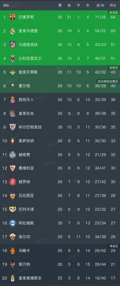 西甲最新积分榜